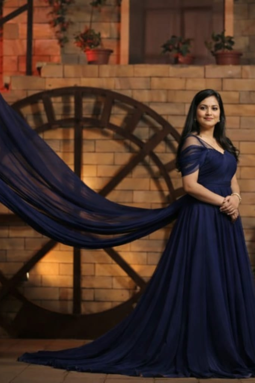An elegant navy blue gown perfect for cocktail parties and evening events. Featuring a dramatic trail that adds a bold yet sophisticated charm.