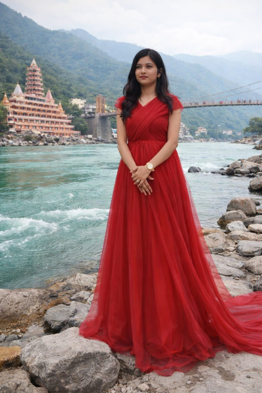 A flowing red gown crafted for romantic pre-wedding shoots and destination moments. Designed to create a graceful silhouette with timeless elegance.