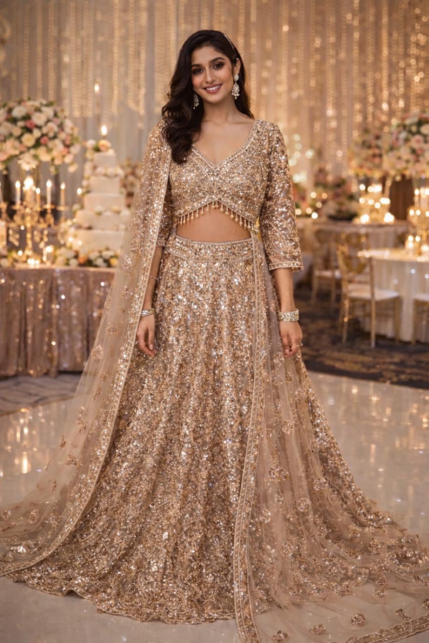 A shimmering reception lehenga adorned with dazzling sequins and intricate beadwork, designed to make you the star of your grand celebration.