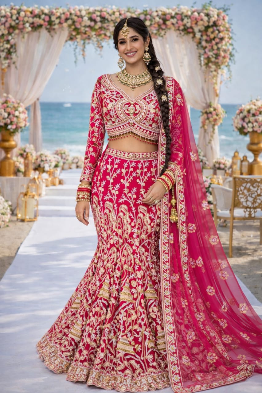 A vibrant crimson bridal lehenga detailed with bold floral embroidery and a scalloped hem, crafted to bring a classic, high-contrast glow to your beachside wedding.