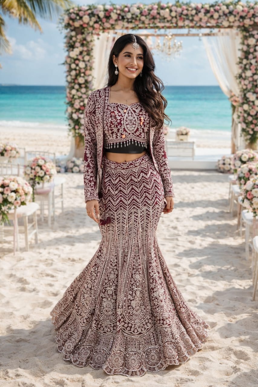 A majestic wine-colored fishcut lehenga paired with a matching embroidered jacket, featuring chevron patterns and traditional motifs for a sophisticated, layered bridal statement.