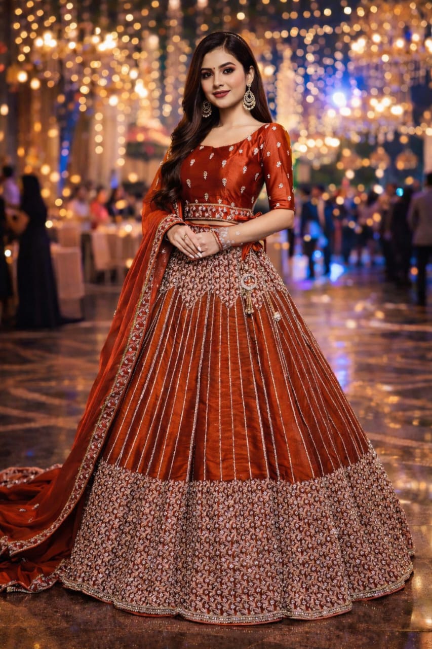A stunning partywear lehenga in a vibrant burnt-orange hue, featuring sleek vertical embroidery and a regal gold-trimmed border, designed to ensure a graceful and radiant presence at every celebration.